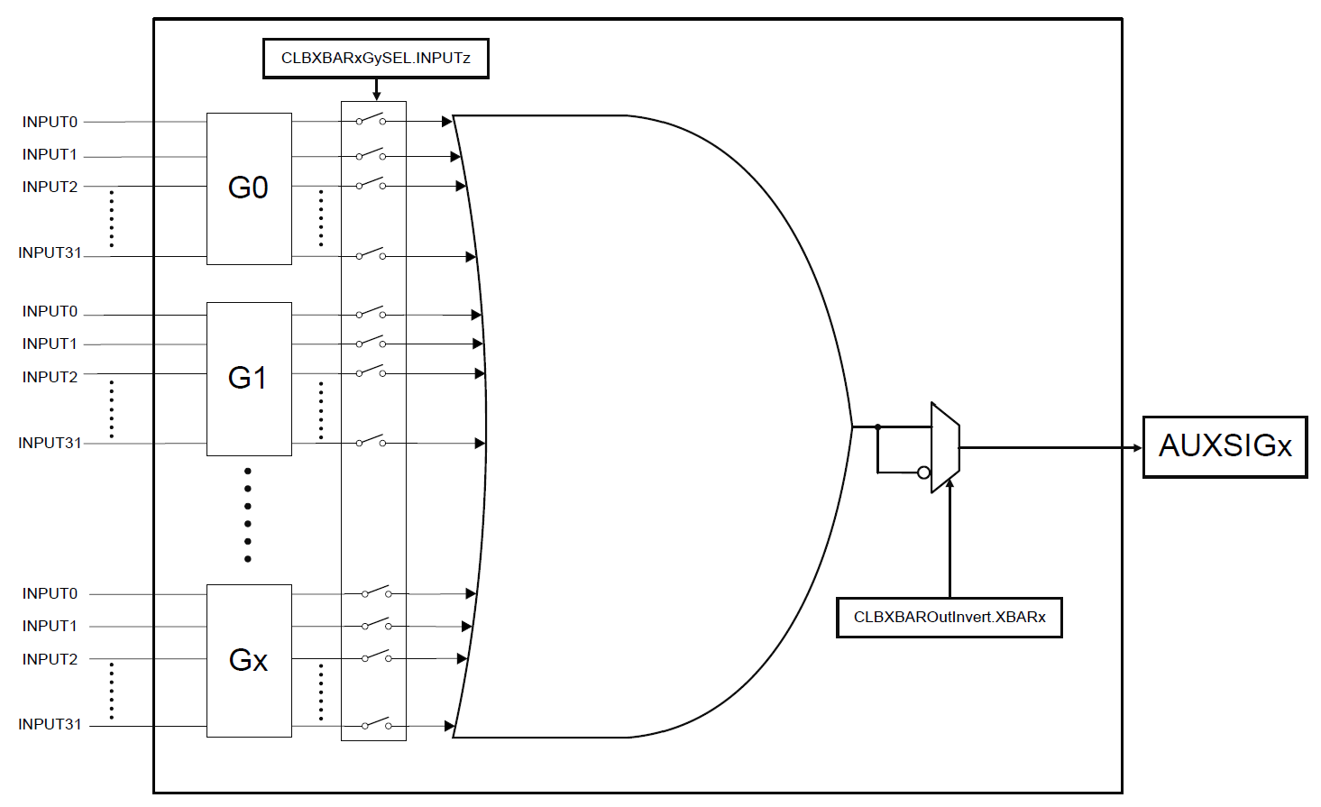The CLB X-BAR brings signals to the CLB modules. The CLB X-BAR has eight outputs that are routed to each CLB module denoted as AUXSIGx where x = 1 to 8. There is one instance of CLB-Xbar per AUXSIG input.
