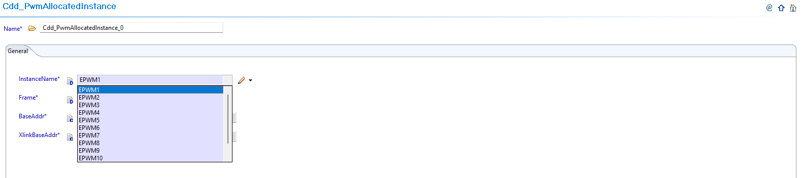 Configure PWM Instance: Configure the InstanceName, Frame, and BaseAddr for each allocated instance: