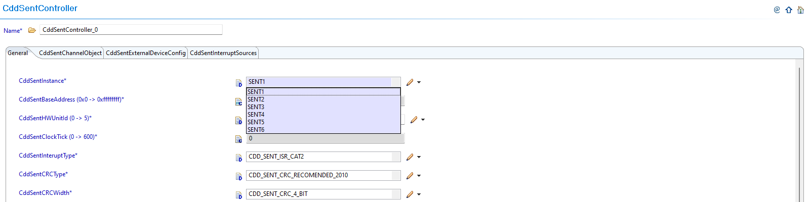Navigate to CddSentController: Navigate to Cdd → CddSentController and update configurations to reference the CDD SENT instances allocated in Resource Allocator