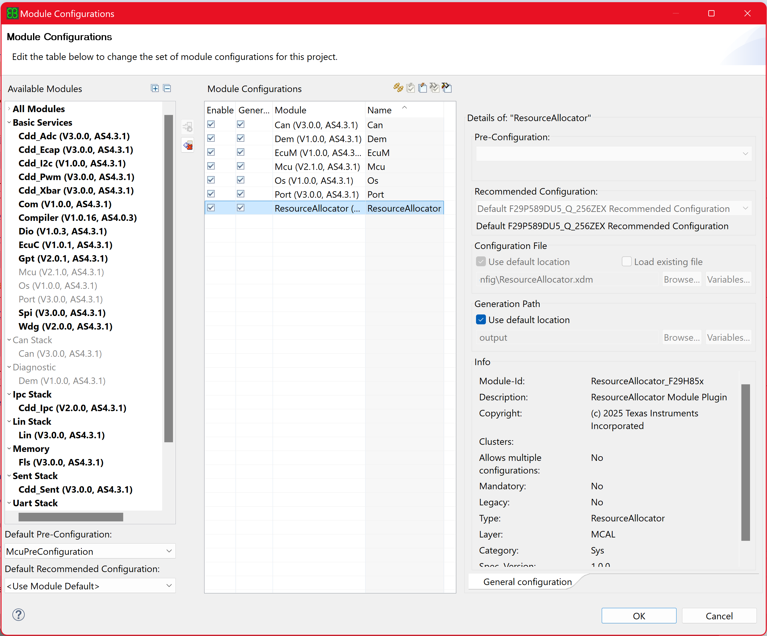 The Resource Allocator is a configuration-only module introduced in MCAL release 01.04.00 as the mandatory foundation for hardware resource management.