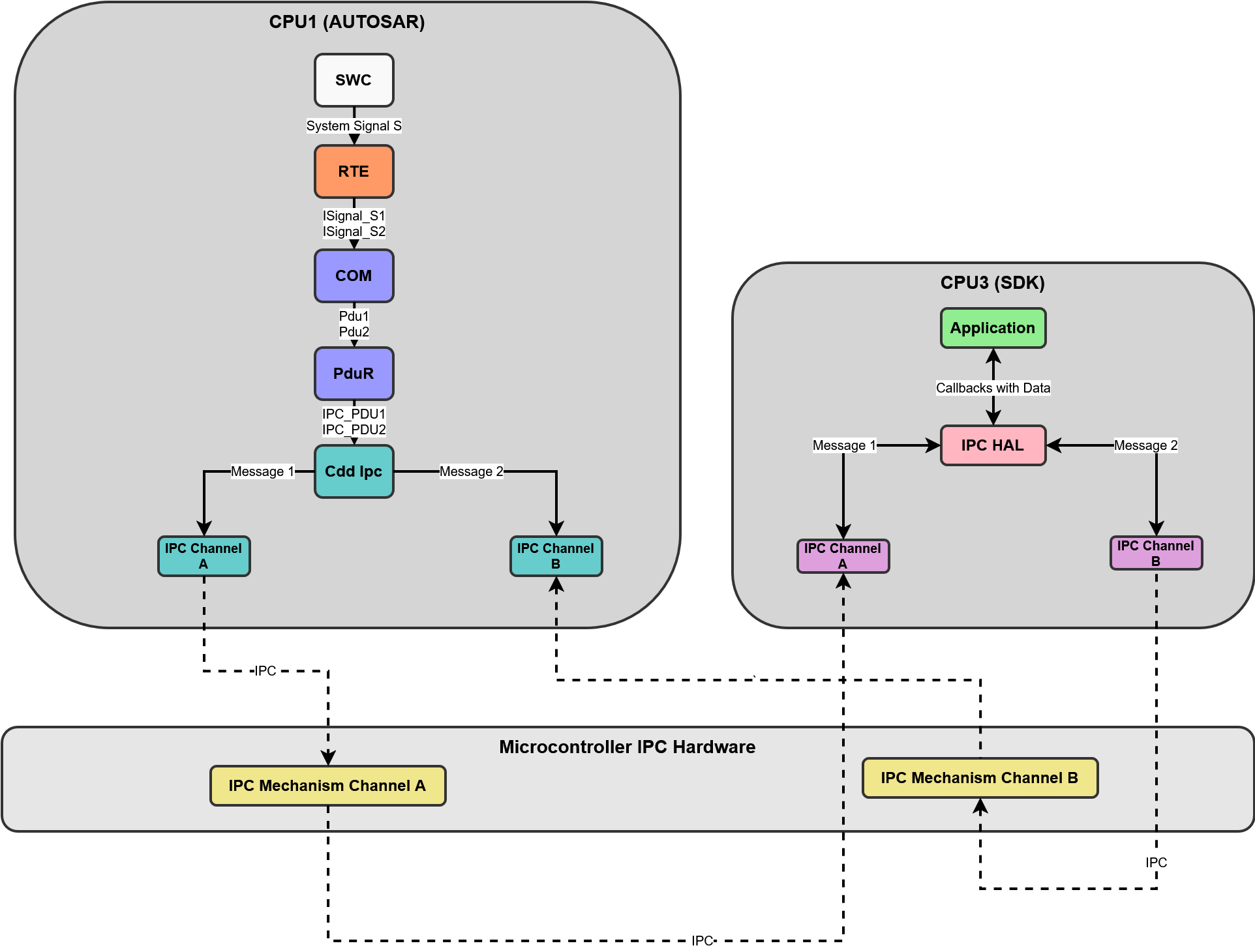 The Cdd Ipc driver is a Complex Device Driver that provides services that allows core hosting MCAL/AUTOSAR to communicate with other cores hosting SDK based IPC driver. This driver could be used to transmit and receive variable length messages up to 12 bytes between cores, via logical communication channels.