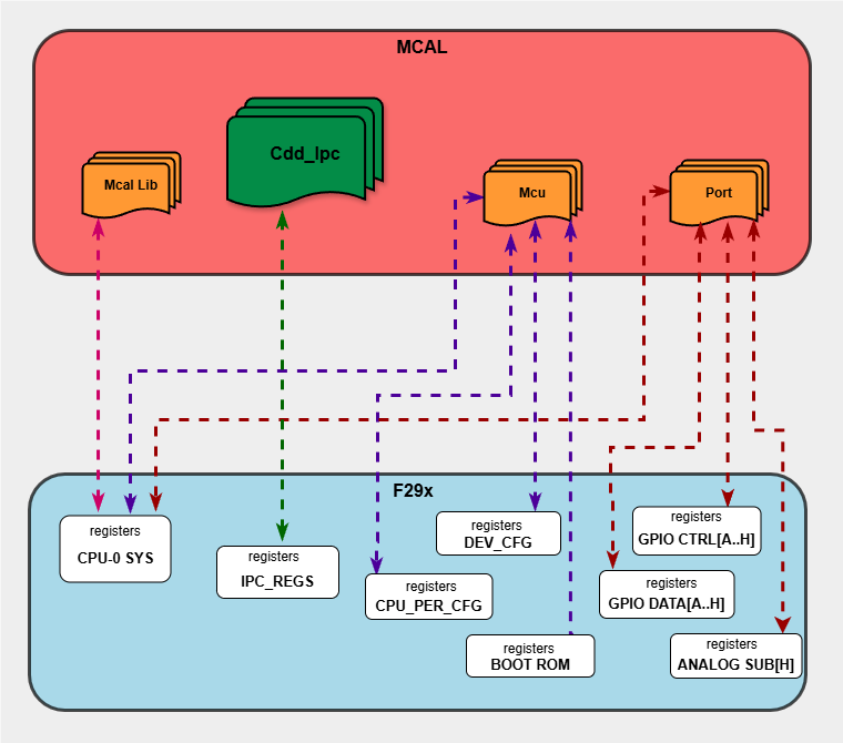 The Cdd_Ipc module allows the core hosting MCAL/AUTOSAR to communicate with other cores hosting SDK-based applications. To enable this communication, the F29H85X-SDK implements an IPC HAL driver that can work on the other cores.