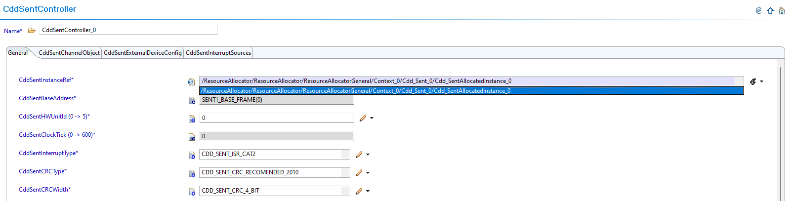 Navigate to CddSentController: Navigate to Cdd → CddSentController and update configurations to reference the CDD SENT instances allocated in Resource Allocator