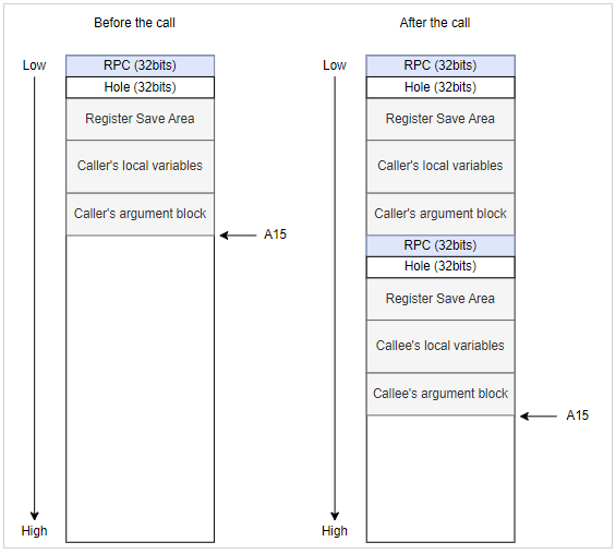 The callee function deallocates the frame and argument block by subtracting the constant computed in step 1. Deallocation can occur either separate from the return instruction via subtraction of the constant from A15 or as part of the return instruction using the ADDR1 addressing mode. If the return instruction is the variant that does not adjust the SP after popping RPC, 8 is added to the constant computed in step 2.