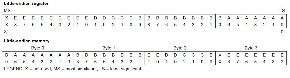 Because the C29x is always in little-endian mode, 4-byte objects are loaded to registers by moving the first byte (that is, the lower address) of memory to bits 0-7 of the register, moving the second byte to bits 8-15, moving the third byte to bits 16-23, and moving the fourth byte to bits 24-31.