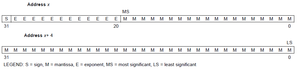 Double, long double, long long and unsigned long long data types are stored in memory in a pair of registers and are always referenced as a pair. These types are stored as 64-bit objects at 64-bit aligned addresses. For FPA mode, the word at the lowest address contains the sign bit, the exponent, and the most significant part of the mantissa. The word at the higher address contains the least significant part of the mantissa.