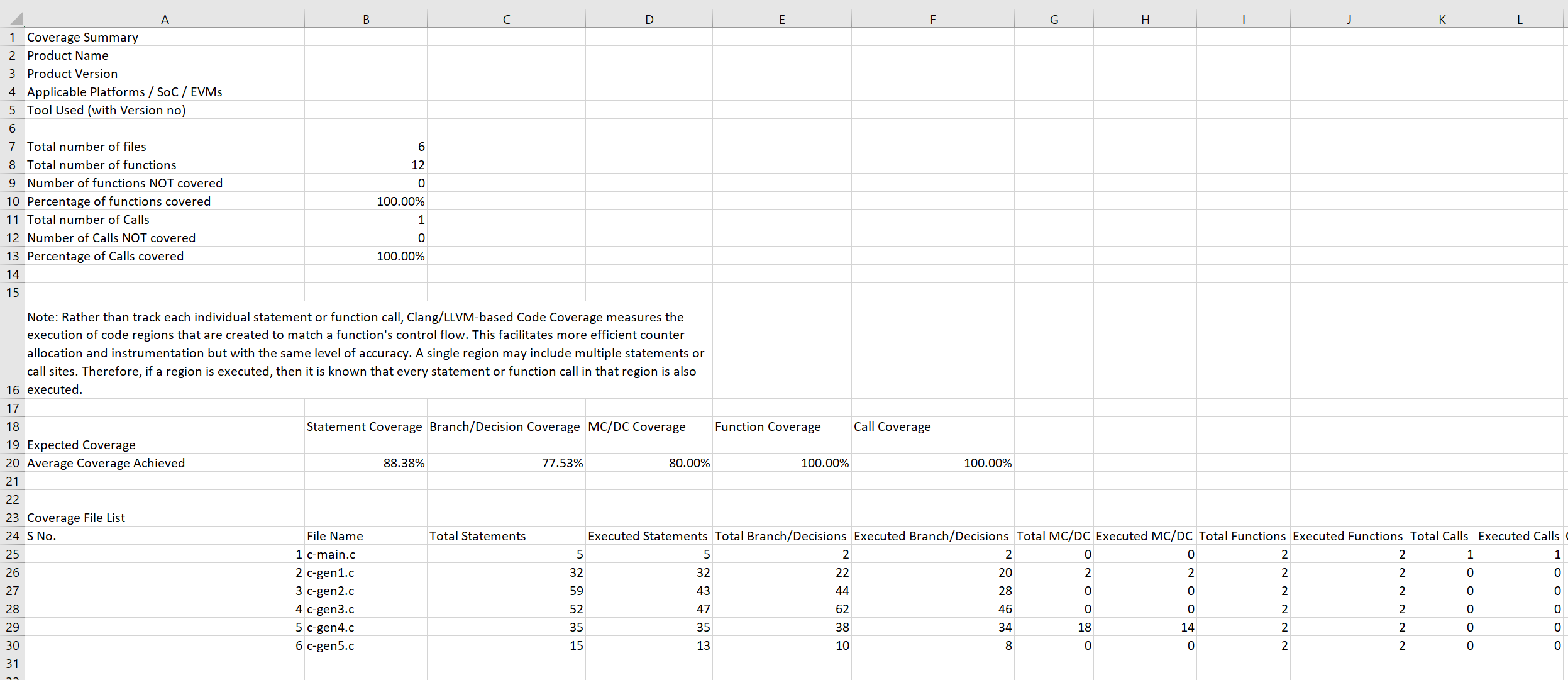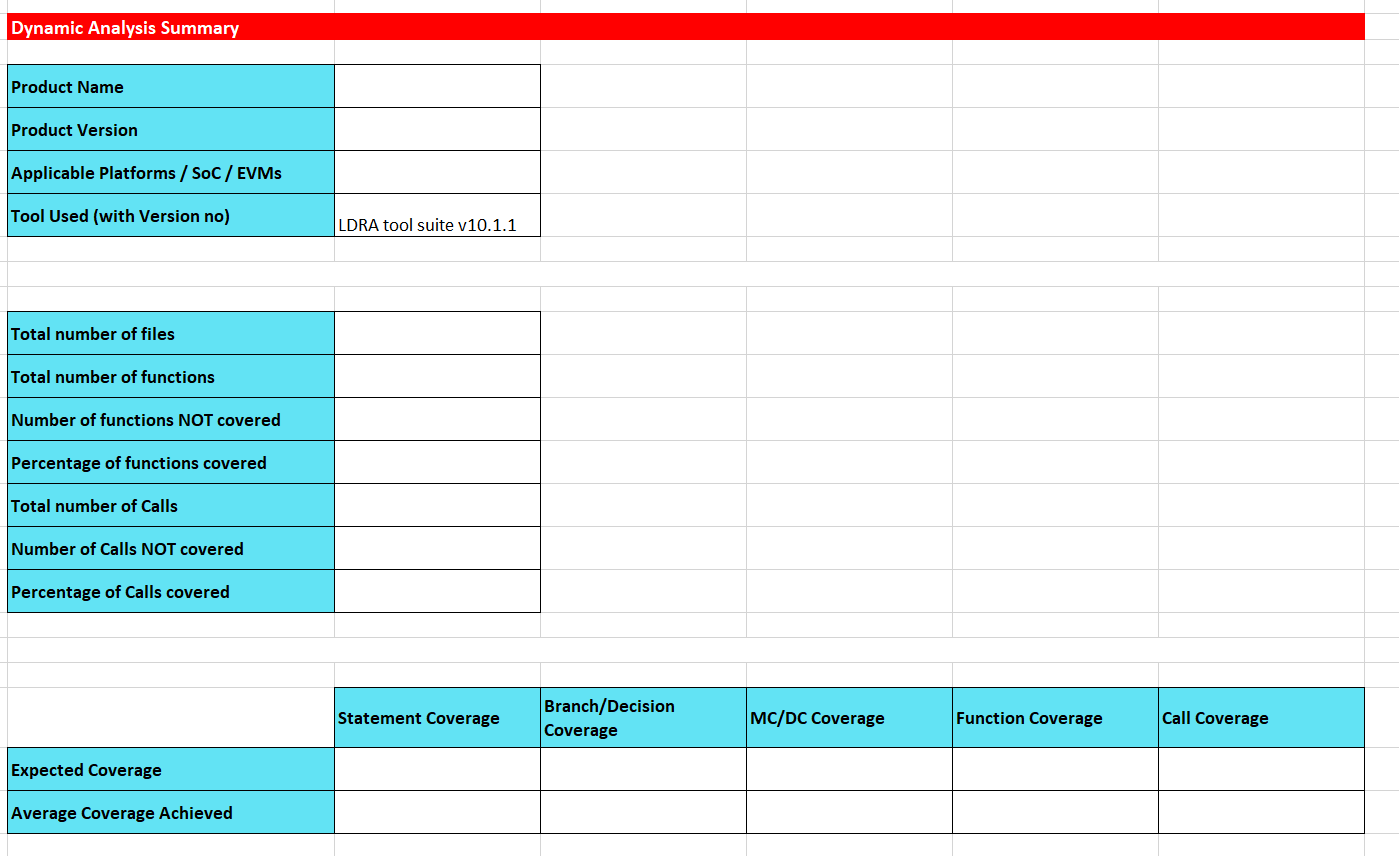 This corresponds to the TI-specified Coverage Report Excel Template (Dynamic Analysis Summary) produced by LDRA: