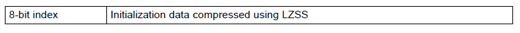 The data following the 8-bit index is compressed using LZSS compression. The run-time support library has the routine __TI_decompress_lzss() to decompress the data compressed using LZSS. The first argument to this function is the address pointing to the byte after the 8-bit index. The second argument is the run address from the C auto initialization record.