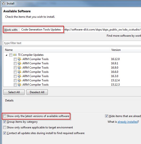 - If an update is required, refer to Installing a Specific TI ARM Compiler for the procedure to install the required TI ARM Compiler version.