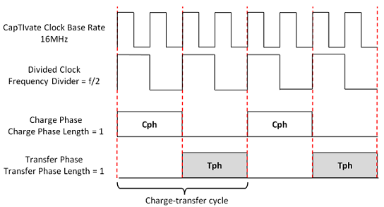 The diagram below shows the basic charge and transfer cycle. The charge phase Cph is used to charge the external unknown capacitance CX. The transfer phase Tph is used to transfer the charge from CX to the internal sampling capacitor CS.The charge transfer time is the time used to complete the charge phase and transfer phase. The charge transfer time depends on conversion frequency divider setting, charge phase length setting and transfer phase length setting in CapTIvate™Design Center. More Info
