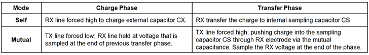 Mutual capacitive mode is the measurement of capacitance between two electrodes; typically a receive (Rx) electrode and a transmit (Tx) electrode. During the charge phase a sample-and-hold circuit drives the Rx node while the Tx node is pulled to ground. In the transfer phase the Tx node is pulled high (driven by Vreg similar to the charge state in self capacitive mode) and the charge across the capacitance is transferred to the sample capacitor.