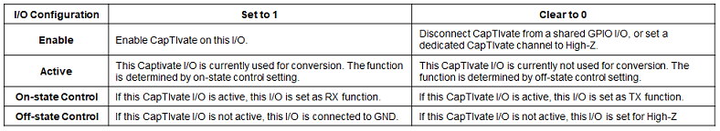 As with most analog peripherals, the IO control can be switched over from the GPIO to the analog functionality by enabling the CapTIvate™function for that IO (refer to the specific datasheet for a description of the IO). In addition to enabling the IO, the CapTIvate™functionality must be defined when the IO is active with the on-state control (receiver or transmitter), and when the IO is not active with the off-state control (ground or high-z). The table below shows the basic CapTIvate I/O configuration.