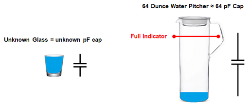 Charge transfer is an effective way to measure a change in capacitance based upon a fixed capacitance. By means of simple analogy, charge and capacitance are represented by a liquid and a container, as shown in Figure 1. The smaller container is the variable capacitance while the larger container is the fixed capacitance.