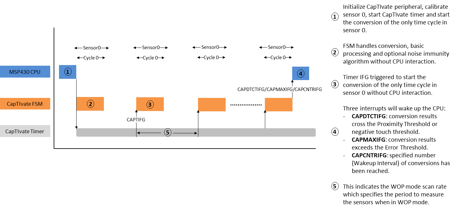 The wake on proximity operation (WOP) is a case where the sensor only has one cycle and no CPU operation is required to load new cycle related values. Specifically the LTA and filter count values are updated by the FSM and are available within the peripheral for successive measurements. As shown in the figure below, cycle 0 is repeatedly measured without CPU interaction.More Info