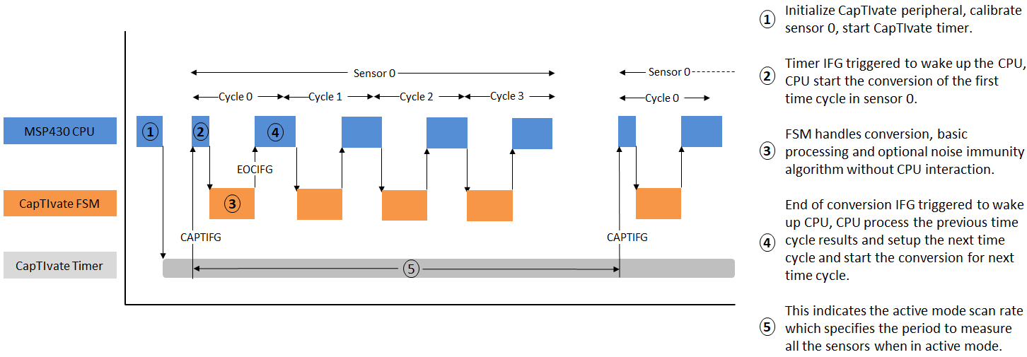 The CapTIvate™peripheral is designed to make single or multiple measurements without any CPU interaction or other peripheral interaction (typically a timer). This is made possible with an integrated timer and finite state machine.
