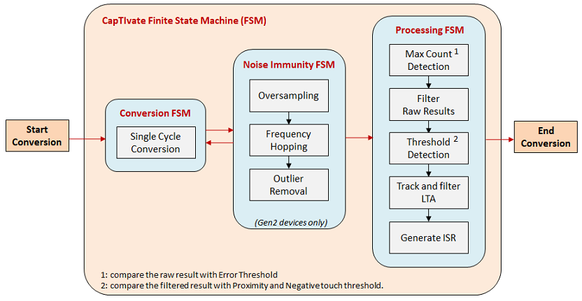 Noise-Immunity FSM (2nd-Generation devices only): the FSM performs oversample averaging, frequency hopping, and outlier removal without CPU interaction.