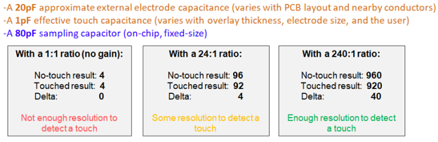 The smaller container is filled (charged) and then emptied (transferred) into the larger container. The number of times it takes to fill the larger container is representative of the volume (capacitance) of the smaller container. If the number of times it takes to fill the larger container changes, then the volume of the smaller container has changed. In most capacitive touch systems, the interest is not in the absolute capacitance but in the change in capacitance. That is when a touch or other interaction occurs, the capacitance of the smaller container changes and consequently the number of times it takes to charge and empty the smaller capacitance into the larger changes. It is this change that is used to determine if a touch occurred.