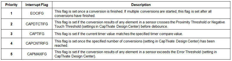 The primary purpose for the timer is to periodically trigger conversion events. The interrupt vector is available and therefore the timer is available to the system as a general purpose timer. The table below show the CapTIvate interrupt flag and trigger conditions.