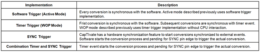 The start of a CapTIvate conversion can be triggered from software, the CapTIvate™timer, the external SYNC pin or a combination.