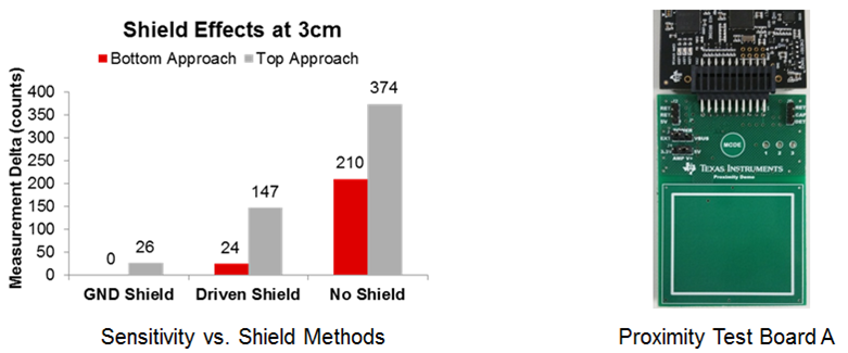 The addition of these dense ground structures serves to limit fringing E-field lines as much as possible, stabilizing the electrodes. Normally the addition of this much parasitic capacitance is considered bad practice, but in the case of noise immunity the trade-off is extremely beneficial. In addition, the gain and offset subtraction capability of the CapTIvate™ technology makes it possible to maintain decent sensitivity even with the ground shield structures.