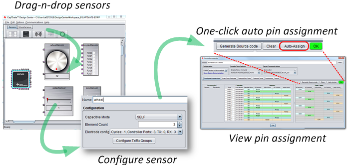 We begin the process by creating a new capacitive touch design using the CapTIvate™ Design Center. With a few simple drag-n-drop inputs and configuration selections, the CapTIvate™ Design Center will automatically determine the optimal pin assignments between the target MCU and the sensors (CapTIvate™ Technology peripheral can measure four channels in parallel). Alternatively, connections can be manually assigned or reserved for those applications with specific routing requirements.