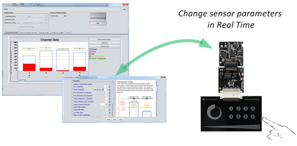 Our PCB is ready to go so we can now begin the process of tuning the sensors for the desired touch and feel. With the MCU programmed with our application and running, the sensors are scanned and real-time data is transmitted to the CapTIvate™ Design Center using the high-speed HID serial bridge MCU on the CAPTIVATE-PGMR PCB. The CapTIvate™ Design Center has several different views to display and monitor the sensor response and allow quick modifications in real-time to the sensor’s parameters, providing instant feedback.